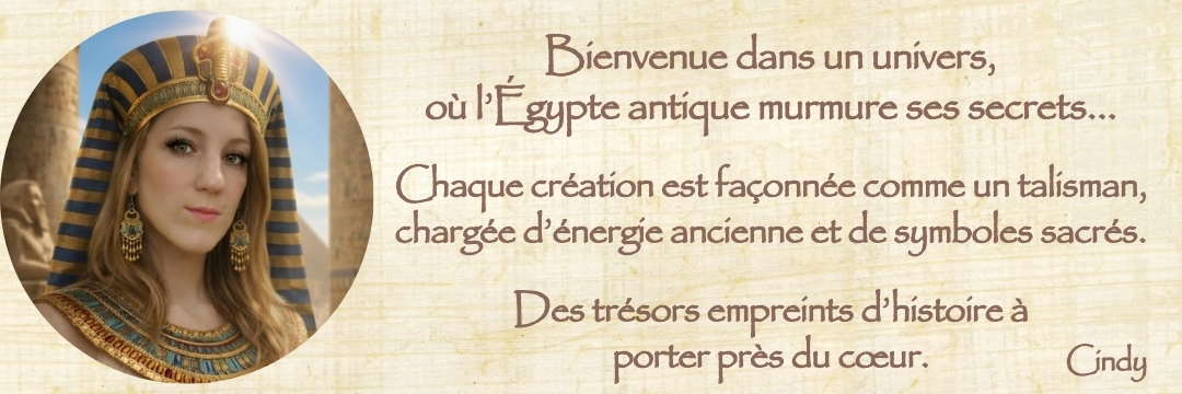 Toutes vos commandes sont préparées avec attention : vos précieux trésors sont soigneusement emballés dans de jolies pochettes en velours bleu et doré, ou dans une boîte à bijou élégante. Le tout avec une touche de magie pour faire de votre expérience un vrai voyage en Egypte ancienne !